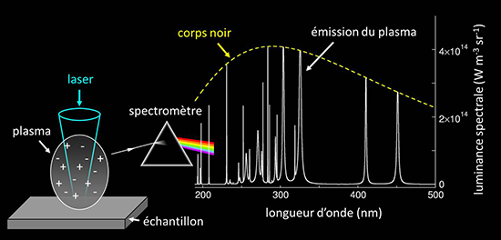 L’analyse consiste à focaliser une impulsion laser à la surface d’un échantillon. La densité surfacique de puissance (éclairement) très élevée conduit à la fusion, puis à la vaporisation et à l’ionisation de la matière. L’ablation laser est suivie par la formation d’un plasma constitué d’électrons libres, d’atomes et d’ions excités. Ce plasma se refroidit au cours du temps, et les atomes et les ions émettent en se désexcitant des photons dont la longueur d’onde est caractéristique de l’élément chimique. La lumière émise par le plasma est alors collectée et analysée par un spectromètre.